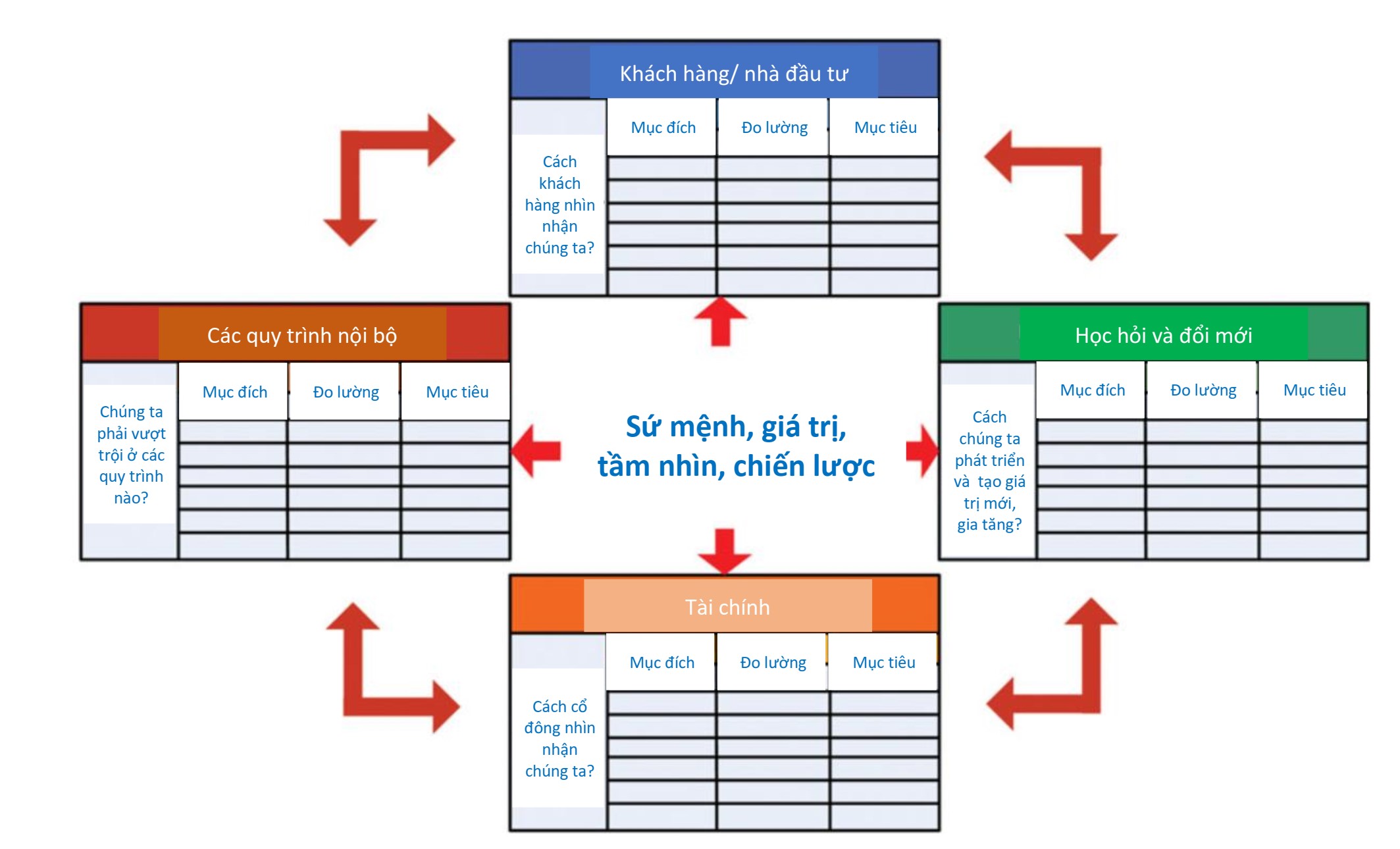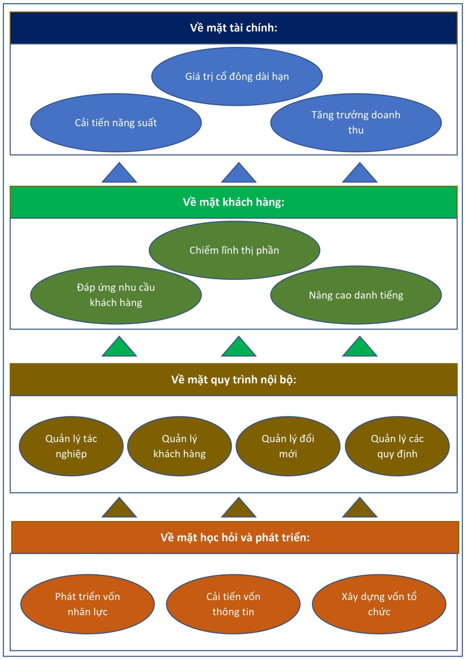 Thẻ điểm cân bằng là phương pháp xác định từ trên xuống dưới nhằm xác định mục tiêu của doanh nghiệp dựa trên 4 khía cạnh: tài chính, khách hàng, quy trình nội bộ, học hỏi và phát triển như minh họa ở hình 4.