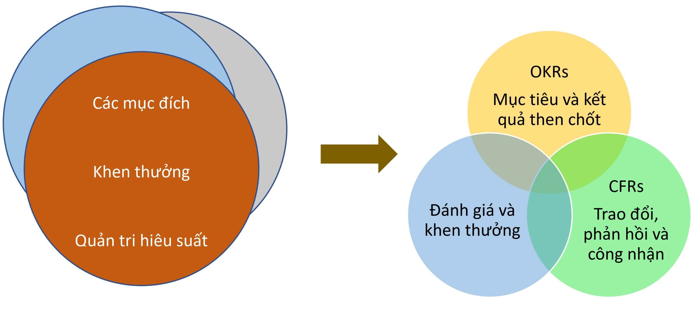 Theo đó, OKRs không gắn trực tiếp với khen thưởng mà thông qua cơ chế hỗ trợ CFRs (Conversations – trao đổi, Feedback – phản hồi, Recognition – Công nhận). Lý do là khi bất kỳ chỉ số hiệu suất hay mục tiêu nào gắn trực tiếp với khen thưởng (như ở chương trình quản trị hiệu suất hàng năm), các nhân sự có xu hướng phòng thủ, bảo vệ mình và/ hoặc báo cáo các số liệu không chính xác.
