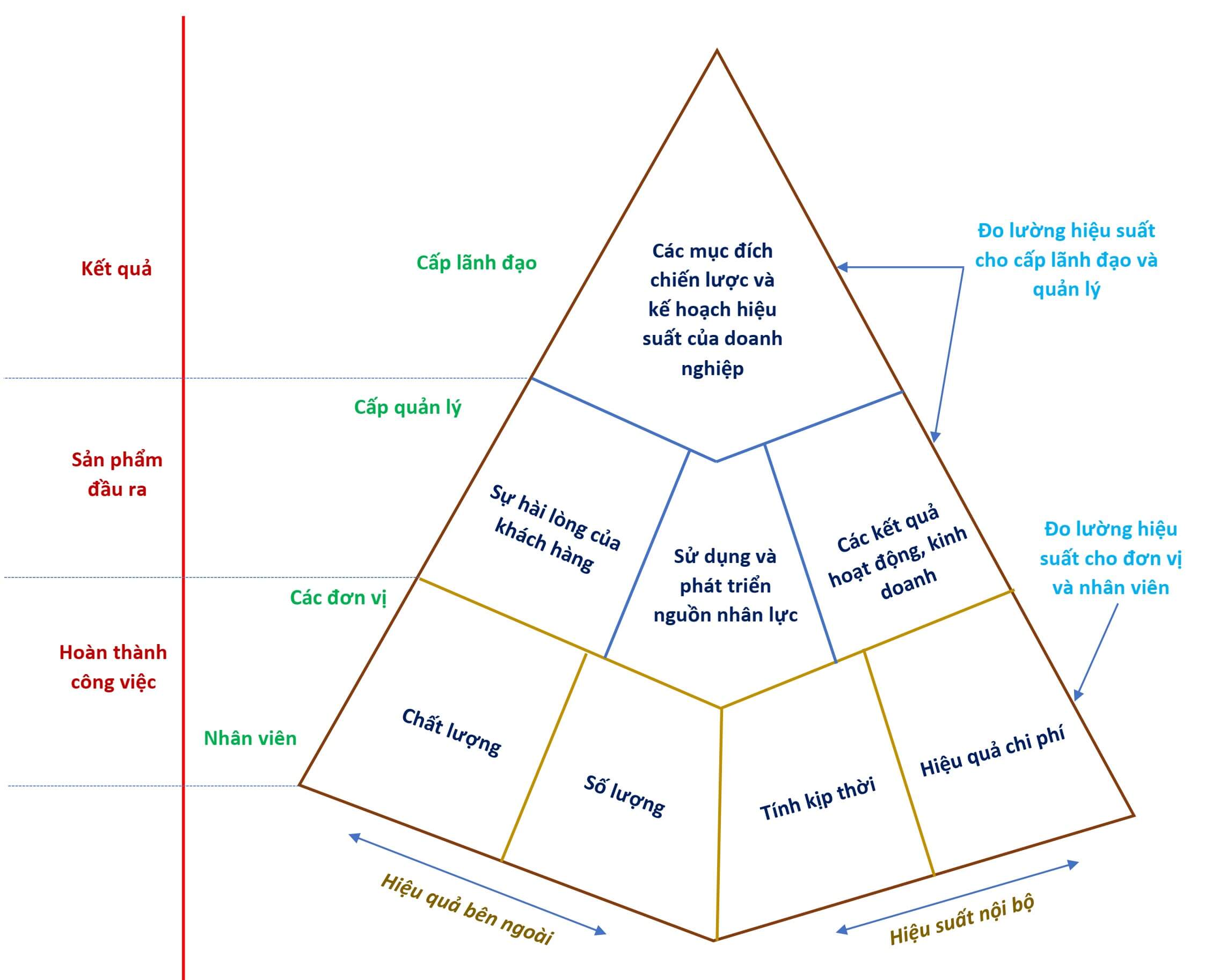 Công tác quản trị hiệu suất thực hiện đo lường các hiệu suất như thế nào? Kim tự tháp ở hình 3 thể hiện các loại đo lường được sử dụng ở các cấp khác nhau trong doanh nghiệp. Ở hai phần trên của kim tự tháp thể hiện đo lường hiệu suất cho cấp lãnh đạo và cấp quản lý. Ở đáy của kim tự tháp là bốn loại đo lường thường được sử dụng để đo lường hiệu suất nhân viên và đơn vị, đó là: chất lượng, số lượng, thời gian và hiệu quả chi phí.