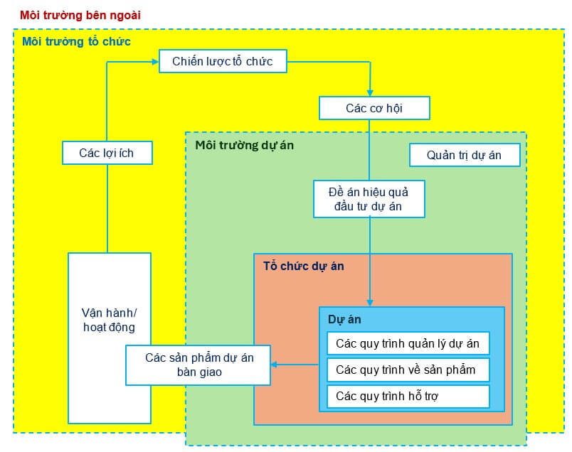 Theo hình 2, từ chiến lược của tổ chức sẽ nhận diện các cơ hội. Các cơ hội sẽ được đánh giá và lập thành tài liệu báo cáo. Tiếp theo đó, các cơ hội được lựa chọn sẽ được phát triển thêm nữa khi lập đề án hiệu quả đầu tư dự án hoặc các tài liệu tương đương khác. Từ đề án hiệu quả đầu tư dự án sẽ có một hoặc nhiều dự án được quyết định phê duyệt triển khai thực hiện. Kết quả thực hiện dự án sẽ cho ra các sản phẩm dự án bàn giao và chúng sẽ được sử dụng để hiện thực hóa các lợi ích. Các lợi ích đạt được lại có thể sử dụng làm đầu vào để tiếp tục phát triển chiến lược của tổ chức, doanh nghiệp.