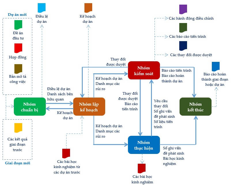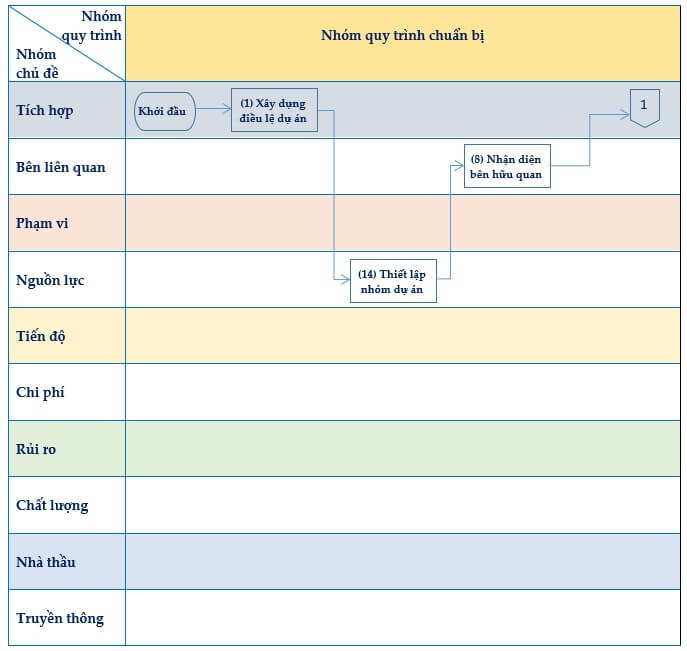 - Nhóm quy trình chuẩn bị: được sử dụng để khởi động một giai đoạn dự án hoặc một dự án, xác định các mục tiêu của giai đoạn dự án hoặc dự án và trao quyền cho giám đốc dự án triển khai thực hiện dự án.