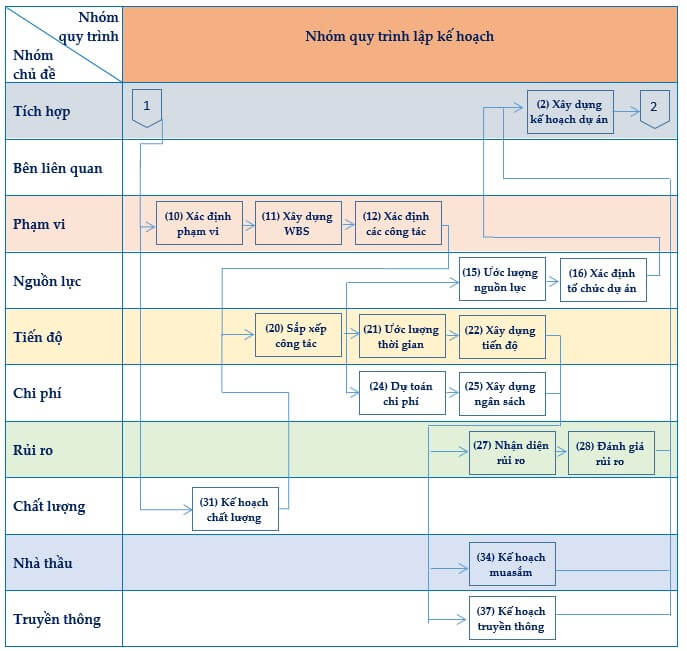 - Nhóm quy trình lập kế hoạch: được sử dụng để phát triển kế hoạch chi tiết và lập các kế hoạch chuẩn (Baseline) làm đối sánh để quản lý thực hiện dự án và đo lường, kiểm soát kết quả thực hiện dự án.