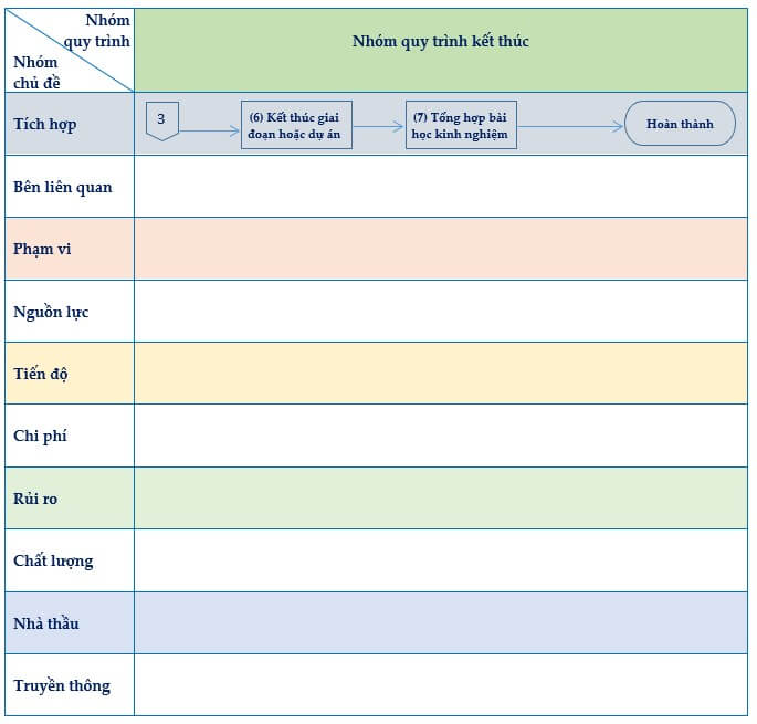 - Nhóm quy trình kết thúc: được sử dụng để chính thức xác nhận hoàn thành giai đoạn dự án hoặc dự án, và để đưa ra các bài học kinh nghiệm.