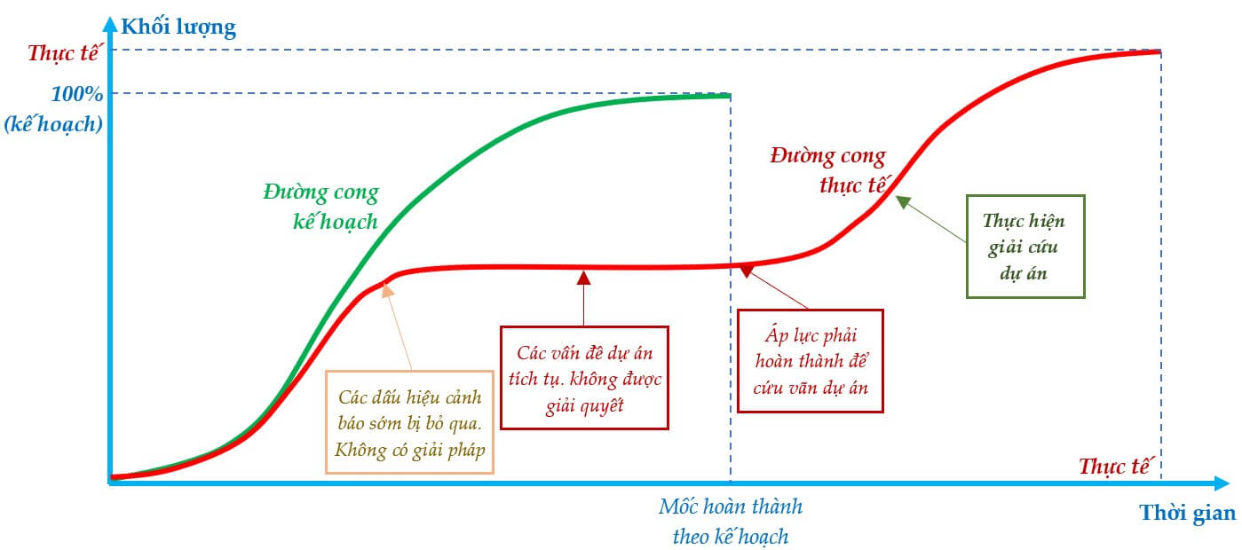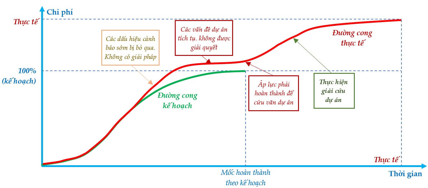 Làm dự án, nếu ngay khi bắt đầu có các dấu hiệu cảnh báo sớm về sự “chệch hướng” của dự án, các bên có các biện pháp khắc phục sớm và hiệu quả thì dự án sẽ dễ dàng được đưa về lại quỹ đạo; nếu để kéo dài cho đến khi dự án trục trặc hay gặp khủng hoảng và vấn đề trở nên nghiêm trọng thì việc cứu vãn dự án trở nên phức tạp, khó khăn và hậu quả về kéo dài tiến độ và mức tăng chi phí trở nên quá lớn như minh họa tại các hình sau đây.