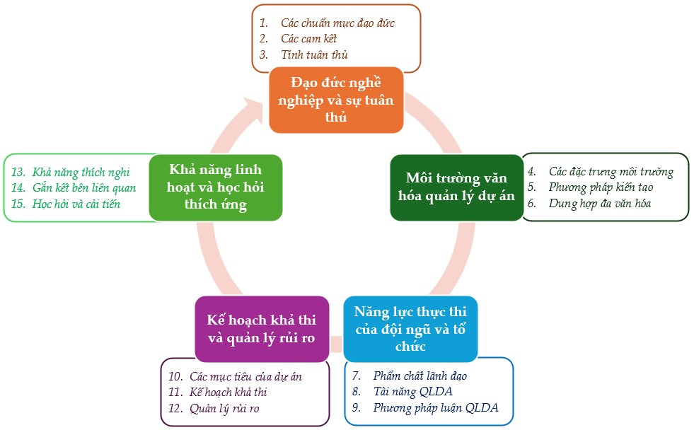 Sức khỏe của dự án và của tổ chức quản lý thực hiện nó có thể được đánh giá dựa trên 5 nhóm tiêu chí: (i) chuẩn mực đạo đức nghề nghiệp và sự tuân thủ; (ii) môi trường văn hóa quản lý dự án, (iii) năng lực thực thi; (iv) quản lý rủi ro và kế hoạch khả thi; và (v) khả năng linh hoạt và học hỏi để thích ứng của tổ chức. Các tiêu chí đánh giá cụ thể được trình bày tại hình 19.8.